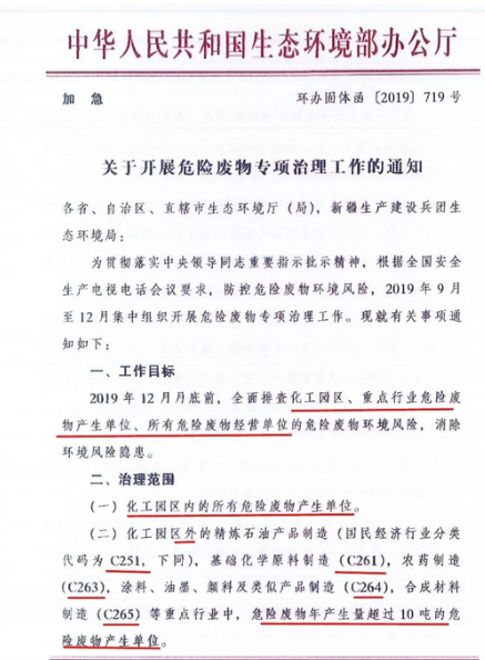 日前生態(tài)環(huán)境部印發(fā)加急文件《關(guān)于開展危險廢物專項治理工作的通知》。